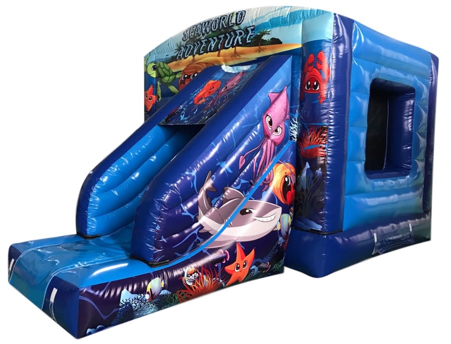 Like our other combi bouncy castles, this features a bouncy castle and a slide, combining two of the greatest party inflatables into one action-packed unit. Kids will have hours of fun bouncing and sliding on this cool under-the-sea Seaworld Adventure bounce and slide inflatable, and when you book with Top Dogs Inflatables, you know you're only ever receiving products of the highest possible quality